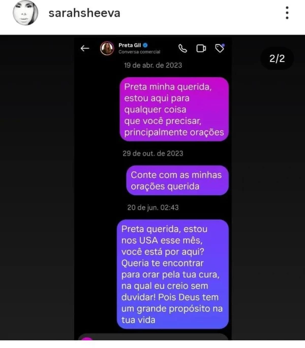 Além da homenagem, Sarah Sheeva também compartilhou capturas de tela das mensagens enviadas a Preta Gil, nas quais se oferecia para orar por ela e expressava fé na cura da cantora. Em uma das mensagens, mencionou que estava nos Estados Unidos e desejava encontrar a artista para orar pela cura dela, acreditando em um propósito divino na vida de Preta. Essas ações não passaram despercebidas na internet, resultando em opiniões diversas entre os internautas. Alguns sugeriram que a falta de resposta de Preta poderia estar ligada a diferenças religiosas, com comentários como “Ela não acreditava na cura através dos milagres de Deus” e “Nem de crente ela gostava”.